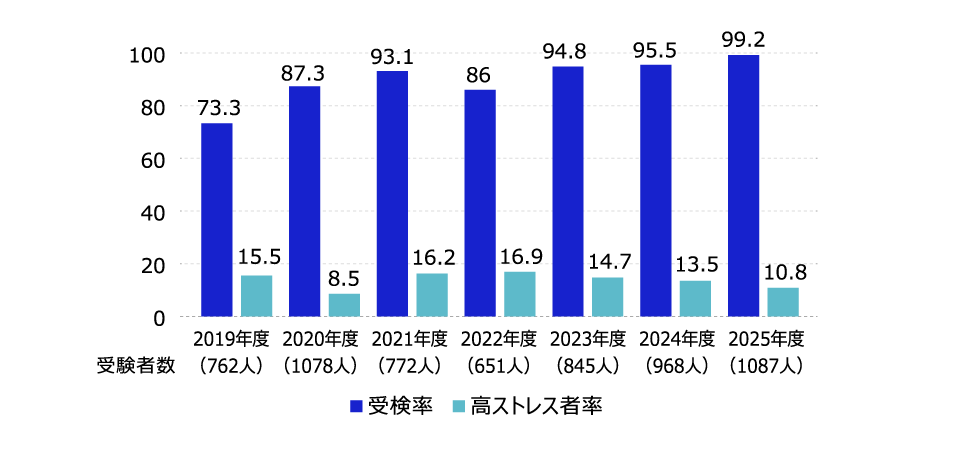 ハイリスク者に対する産業医の面談を100%実施しており、保健指導の継続に努めています。